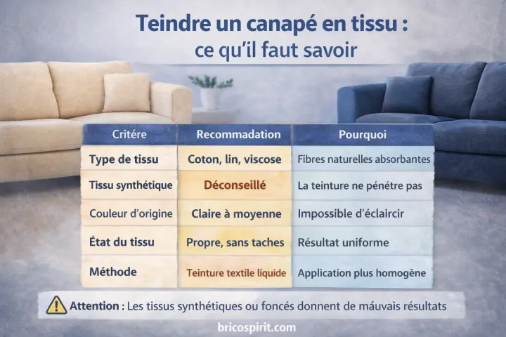 Avant de vous lancer, il est utile de connaître les bonnes méthodes pour nettoyer un canapé en tissu, car une surface propre est indispensable pour un résultat homogène. Vous pouvez aussi vous inspirer de conseils déco pour harmoniser votre intérieur ou découvrir comment enlever les taches tenaces avant la teinture.